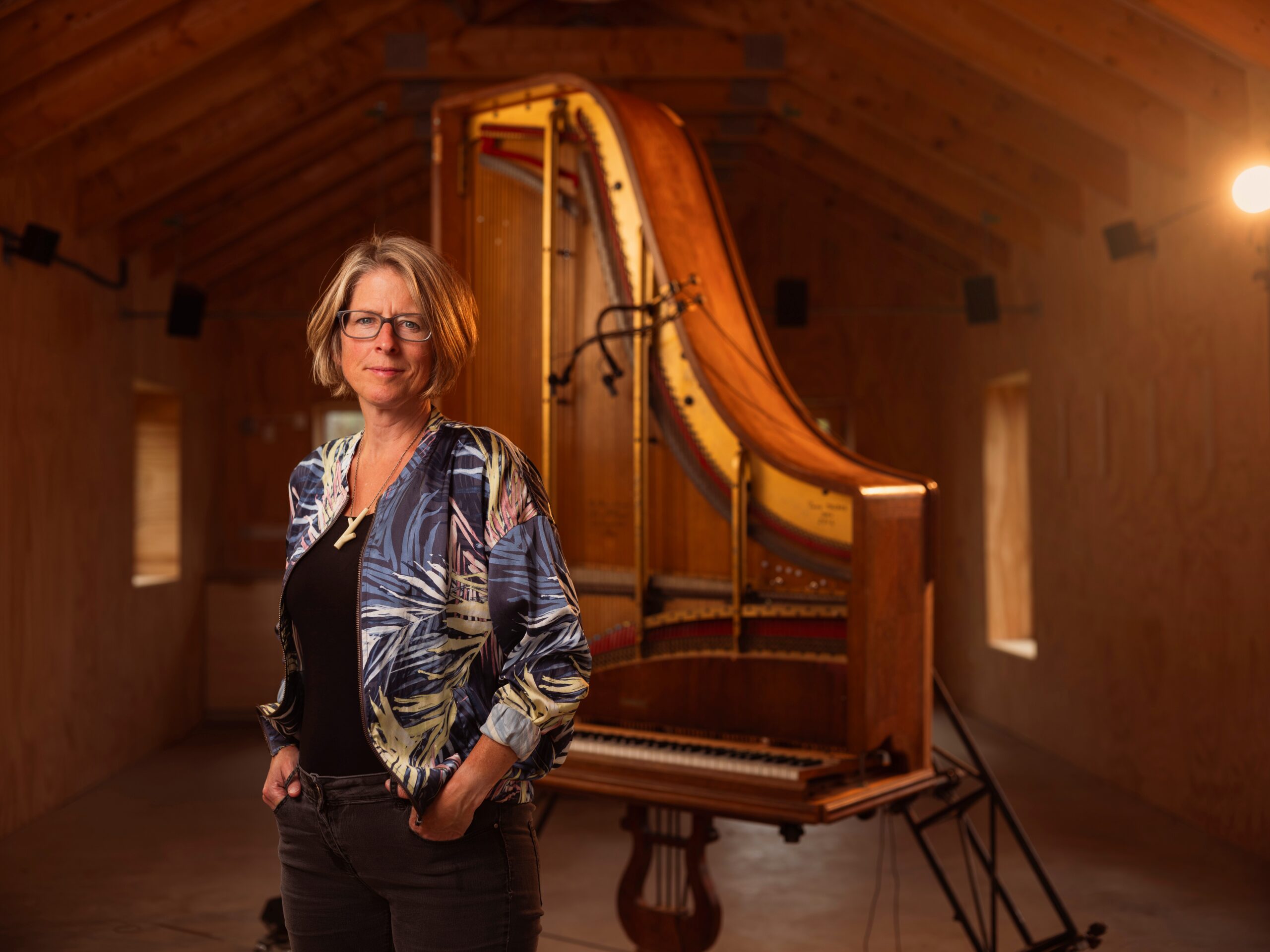 First Light Pianos Founder-Director Sarah Nicolls with her prototype ‘Inside-Out Piano’